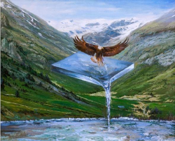 В центре картины изображён орел, раскинувший крылья и парящий над льдиной, с которой льётся вода в озеро, а сама квадратная холодная льдина написана, как раскрытая книга вечности.