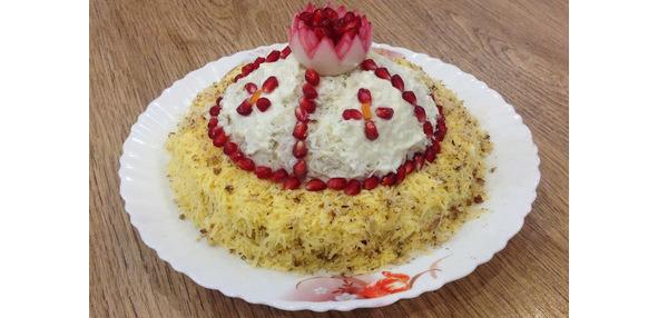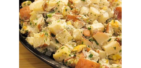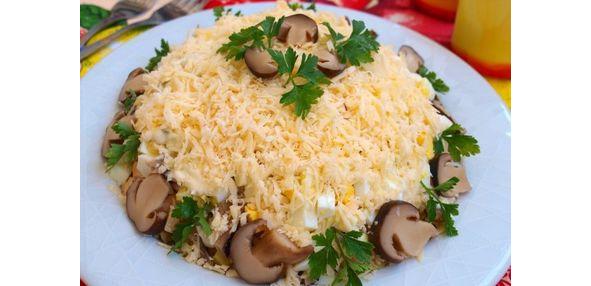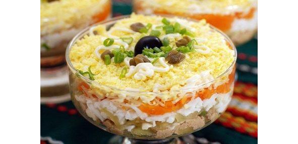 Способ приготовления: На дно глубокого салатника выложить небольшие кусочки куриного филе, обжаренного на растительном масле. На него — маринованный лук. На лук выложить вареный картофель, нарезанный кубиками. Все это залить майонезом. Следующий слой выкладывать половинками фаршированных яиц, которые готовить так: вареные яйца разрезать пополам, вынуть желтки, перемешать их с рубленым чесноком, перцем, солью и майонезом. Яйца уложить на последний слой разрезами вниз. Снова все залить майонезом. Сверху щедро посыпать тертым сыром.