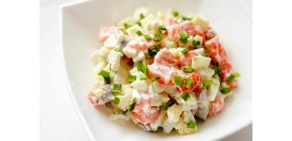Способ приготовления: Яблоко порезать соломкой, семгу, яйца и картофель — кубиками, Лук нашинковать. Все заправить майонезом.