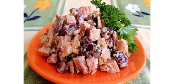 Способ приготовления: Огурец соленый нарезать полукольцами, сыр твердый — квадратами, лак репчатый порезать полукольцами и замариновать. Колбасу также квадратами. Добавить фасоль. Смешать все компоненты и залить майонезом.