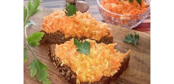 Способ приготовления: Творог протереть и соединить с протертой морковью. Добавить мелко нарезанный зеленый лук, соль, тмин, майонез и мелко нарезанное яйцо. Украсить укропом готовый салат.