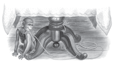 Утром вскочил и, не одеваясь, к Яшке. Нет Яшки на верёвке. Верёвка есть, на верёвке жилет привязан, а обезьянки нет. Смотрю – все три пуговицы сзади расстёгнуты. Это он расстегнул жилет, оставил его на верёвке, а сам драла. Я искать по комнате. Шлёпаю босыми ногами. Нигде нет.