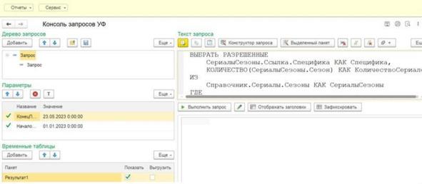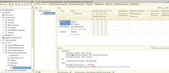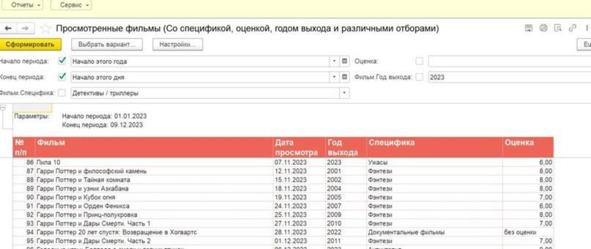 Целью программиста при создании самописной конфигурации для учёта просмотренных фильмов было создание справочников, их форм, реквизитов и табличных частей (на примере справочника «Фильмы» реквизиты «Год выхода», «Просмотрен», «Дата просмотра», «Специфика», «Оценка»), чтобы пользователь мог в режиме «1С: Предприятие» создавать элементы данных справочников, и создание отчётов, с помощью которых пользователь может видеть данные из элементов справочников в определённых разрезах, которые нужны ему. Отчёты созданы с помощью запросов 1С — этот механизм позволяет получать данные из базы 1С (разница между конфигурацией и базой: конфигурация — программа, написанная на 1С; база — место хранения данных, основанное на определённой конфигурации). Запросы 1С похожи на SQL-запросы, только имеют русский синтаксис. Тестируют запросы в режиме «1С: Предприятие» на реальных данных с помощью специальной обработки «Консоль запросов».