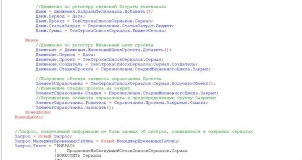 — написание/коррекция обработок проведения документов по различным регистрам сведений, регистрам накопления, регистрам расчёта (реальные отчёты желательно создаются таким образом, чтобы они забирали данные именно из регистров, а не из документов или справочников);