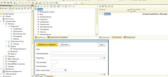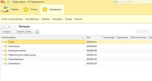 На скриншотах выше мы видим, что 1С крайне удобен в том, что синтаксис его в отличие, например, от Java или C++, сделан на русском языке. И для программирования на нём нужна лишь одна программа, а не несколько (одна для написания кода, другая для отладки). Конфигурация 1С в Конфигураторе состоит из объектов (которые вы видите на первом скриншоте): справочников, документов, регистров сведений, регистров накоплений, отчётов, обработок и т. д. Справочник «Фильмы» в режиме «1С: Предприятие» мы можем наблюдать на втором скриншоте выше. Данная самописная конфигурация основана только на справочниках и отчётах: