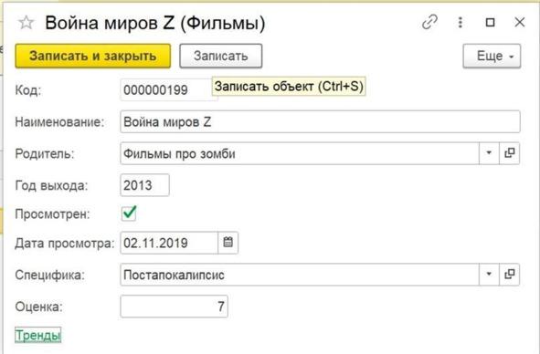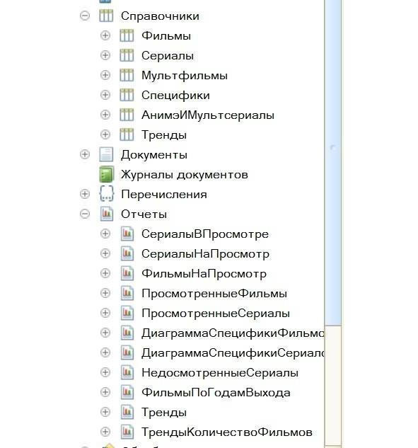 Для примера буду использовать самописную конфигурацию для учёта просмотренных фильмов и сериалов. Необходимо подчеркнуть, что это всего лишь самые азы на примере очень лёгкой конфигурации. На реальных готовых решениях всё ГОРАЗДО сложней.