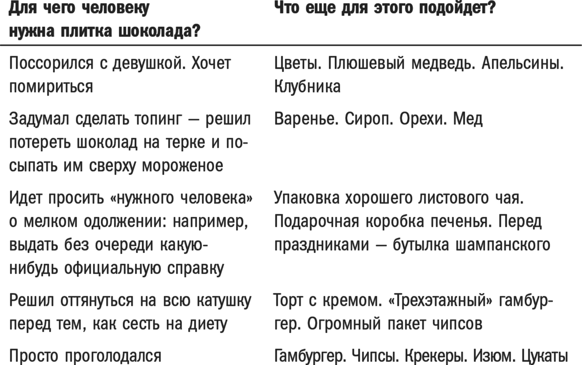 Давайте разберемся на примере. Представьте, что некий человек приходит к вам в магазин в поисках плитки шоколада. Для чего эта плитка могла бы ему понадобиться? Если вдуматься, вариантов бесчисленное множество.
