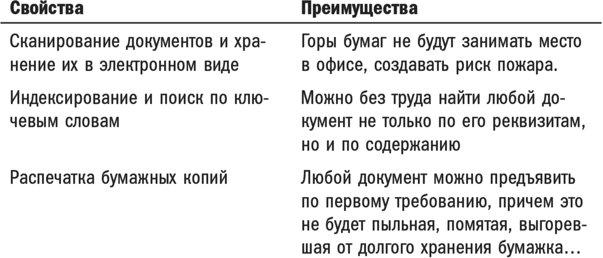 Например, рассказывая о продуктах для ведения электронного документооборота, можно взять следующие свойства и перевести их в следующие преимущества.
