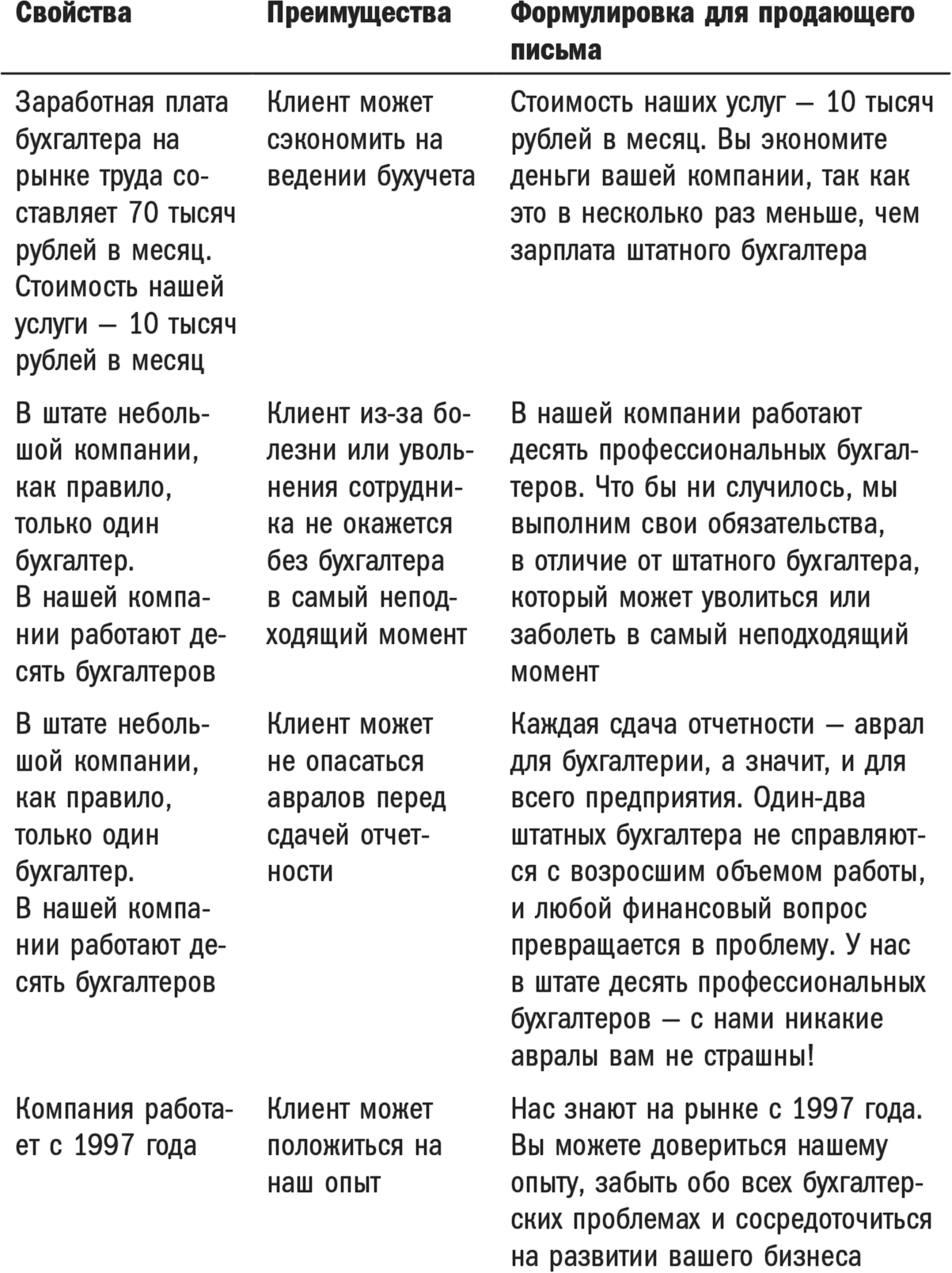 Или еще пример, снова из книги Сергея Бернадского. Представьте, что ваша компания предлагает другим предприятиям услуги по ведению бухгалтерского учета и эти услуги вы хотите продать. Вы составили список свойств, которые важно упомянуть в тексте: