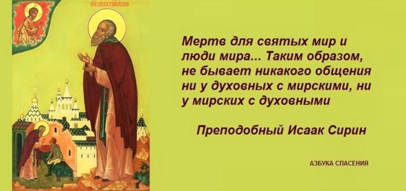 Мертв для святых мир и люди мира. Почему как мирские видя не видят добрых дел святых мужей и, слыша не могут нисколько понять Божественных словес, предлагаемых им благодатью Святого Духа, так и духовные и святые мужи не могут видеть лукавых дел лукавых мирских людей и понять страстных речей их, т.е. и они видя не видят, что в мире, и, слыша о том, что касается мирских людей, находятся в таком Божественном состоянии и расположении, что как бы не слышат того, по неимению к тому чувства. Таким образом, не бывает никакого общения ни у духовных с мирскими, ни у мирских с духовными.