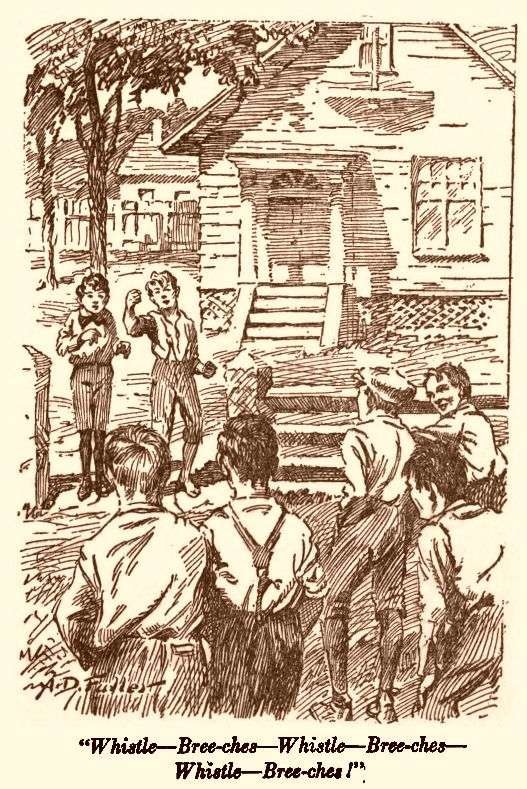 Bob stopped suddenly. He looked at Red Head in astonishment. Then he turned and ran to the boys by the gate. They listened to what he said, and then began a loud singsong chant: “Whistle—Bree-ches —Whistle—Bree-ches—Whistle—Bree-ches!”