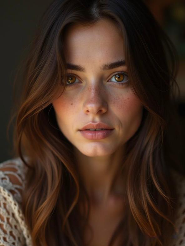 Она была девушкой необычной красоты: ее глаза — это теплый кофе перед рассветом, когда в чашке еще плавают золотистые искры неразбуженного кофе. Глаза глубоко карие, с янтарными вкраплениями- будто кто-то растер в темноте кусочки осенней листвы. Когда она злилась, взгляд становится почти черным, а в моменте же нежности- светлеют до оттенка меда. Волосы густые, падающие локоны цвета темного ореха с шоколадом. На солнце проступает рыжеватый подтон. Но самое удивительное, это то, что с рождения, у нее с левой стороны одна прядь — серебряная.