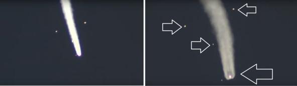 Хорошо известно, что отделение первых четырех боковых ускорителей у ракеты «Союз» происходит на высоте, примерно, 45—50 км. Отделение второй ступени (центральный отсек) на высоте 175—190 км. В зависимости от условий атмосферы эта высота может оказаться и ниже. Главным моментом для начала образования такого явления в этом случае было прекращение образования инверси
