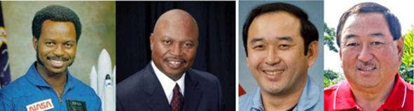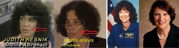 Слева, Роналд Эрвин Макнейр, далее он же, представляется братом близнецом. Справа, Эллисон Сёдзи Онидзука, далее, якобы, его брат близнец. Эти персонажи, согласно публикации изменили только имена: «Двое других живых астронавтов, не такие смелые, как их вышеупомянутые коллеги, выдают себя за братьев близнецов. Довольно неожиданно, что у двоих астронавтов оказались братья близнецы. У меня лично, за всю жизнь, никогда не встречалось такого, что бы в одной небольшой группе людей, встретилось 2 человека с близнецами братьями. Документы НАСА подделать не сложно. Подделали ли же Обаме свидетельство о рождении, подтверждающее, что он американец. А вот этим двум проблем тем более не составило». [4] Осталось выяснить, есть ли действительно у этих персонажей братья близнецы! Не просто братья, а именно близнецы! Нашлись две женщины, очень похожие на тех, которые были, по версии НАСА, в погибшем шаттле в январе 1986 году: «Женщины „Чалленджера“ тоже живы и здравствуют. Обе преподают юриспруденцию в Йельском и Сиракузском университетах соответственно».