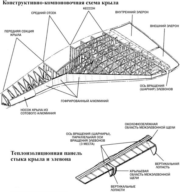 Большие сомнения вызывает защита отсека где находится шасси. Очевидно, что это очень слабое место такой конструкции. После прохождения сильного аэродинамического нагрева, мощного ветрового потока створки отсека для выдвижения колеса шасси могут не открыться. Сама теплозащита в нижней части крыла тоже вызывает сомнения в надежности такой защиты. Конструктивно-компоновочная схема крыла американского шаттла, согласно сведениям из НАСА изготовлена из алюминия. Из представленной, ниже, схемы хорошо видно, что на элеронах, например, отсутствуют теплозащитные плитки. Без абляционной защиты здесь не обойтись.
