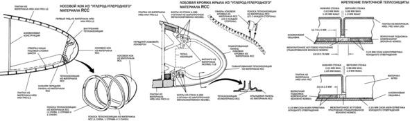 Что касается тепловой защиты, то максимальное значение температуры нагревание теплозащитных плит, на которое рассчитывали американцы, было подозрительно небольшим: «Теплозащита предназначена для поддержания температур обшивки не выше 450°К, стенок кабины экипажа — не выше 322°К, внутри ОПН — не выше 366°К, а в отсеках, где размещаются двигатели и шасси, — 450°К, хотя при входе в атмосферу отдельные участки наружной поверхности нагреваются до 1755°К. На различных участках корпуса в зависимости от степени нагрева при входе в атмосферу теплозащита выполнена из различных материалов». [12] Собственно описание ниже показывает, что американцы на самом деле применяли все ту же старую абляционную защиту, только в этот раз ее просто так не называли: «Нос фюзеляжа и передние кромки крыльев, нагревающиеся до 1755ºК, защищают теплозащитой RCC («углерод-углерод»), представляющей собой многослойную конструкцию из углеродной ткани, пропитанной фенольной смолой. Конструкция наиболее теплонагруженных элементов показана на схеме: