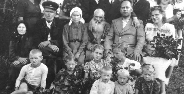 Константин Дмитриевич в центре с орденом на груди, рядом — супруга в белом платке. В фуражке мой дед Григорий Дмитриевич, моя бабушка Дарья Ивановна — в черном платке