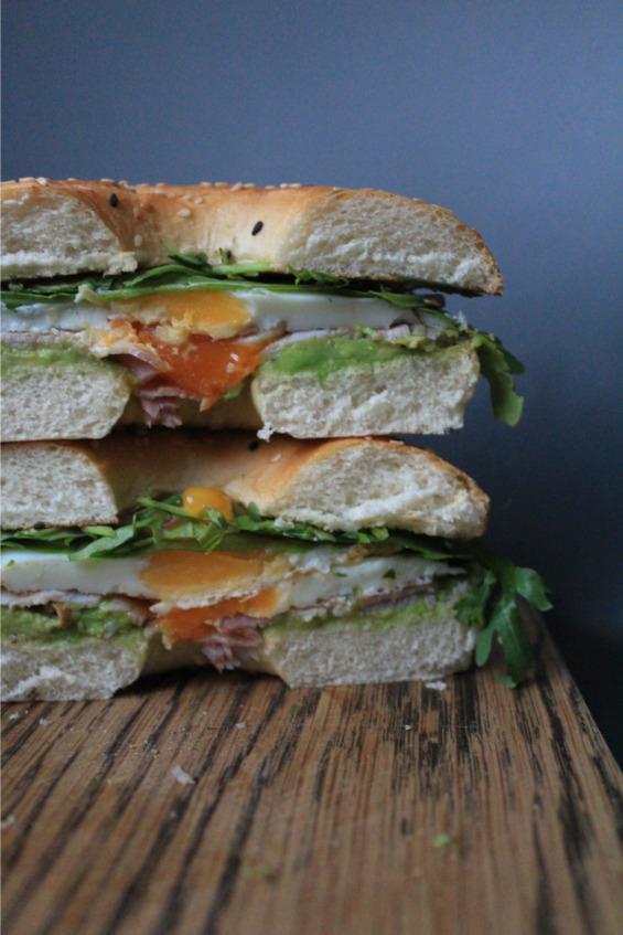 4. На нижнюю часть бейгла выкладываем авокадо, затем поливаем бальзамическим соусом, выкладываем ветчину, 2 яйца, рукколу и закрываем второй частью бейгла.
