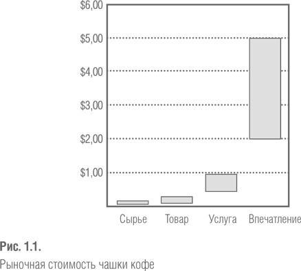 Давайте возьмем в качестве примера настоящий сырьевой товар: кофе. Компании, которые собирают кофейные зерна или торгуют ими на фьючерсном рынке, получают (на момент написания этой книги) немногим более 1,65 долл. за килограмм, т.е. 1 или 2 цента за чашку. Когда производитель обжаривает, перемалывает, упаковывает и продает те же самые кофейные зерна в бакалейной лавке, превращая их таким образом в товар, для потребителя цена возрастает до 5–25 центов за чашку (в зависимости от торговой марки и размера упаковки). Если же сварить кофе в самом обычном, ничем не примечательном придорожном кафе, ресторане быстрого обслуживания или баре, эта услуга будет стоить уже от 50 центов до 1 долл. за чашку.