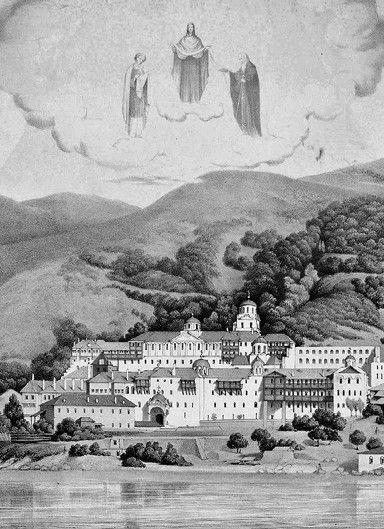 Пантелеимоновский монастырь на горе Афон. А. Т. Траншель. Литография. XIX в.