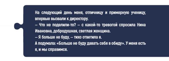 — Ну хоть кто-то выучил параграф и сделал задание, молодец! — слышала я от учителей, но уже в средней и старшей школе. Меня часто хвалили — называли «светлым пятном» на фоне среднеуспевающего класса. Но эта похвала чаще всего приносила мне не радость, облегчение, гордость — она приносила с собой только унижения и насмешки, а иногда и прямые вызовы от «дружного класса».
