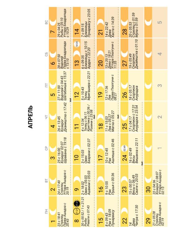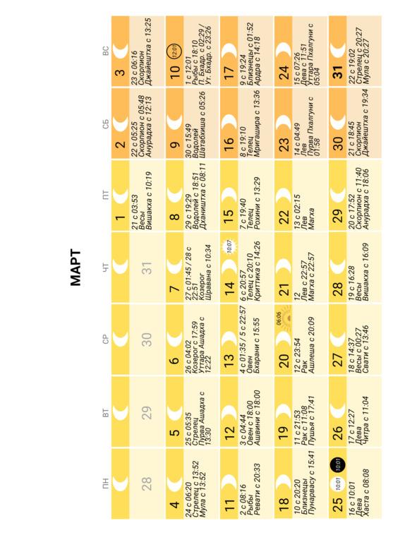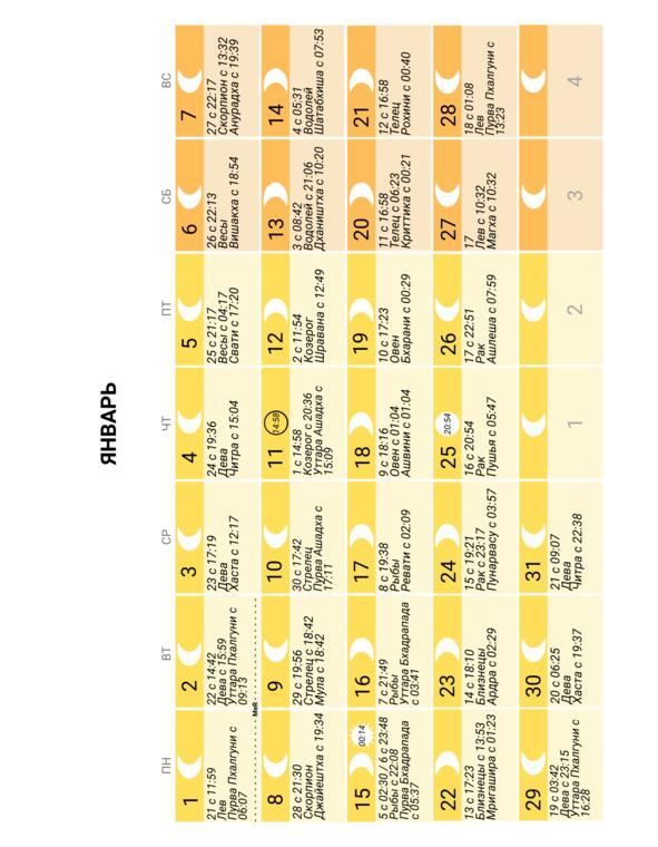 — положение Луны в знаке Зодиака и накшатре (лунное созвездие) и время смены одних на другие;