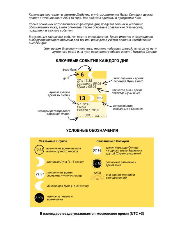 Календарь, который вы держите в руках, может стать для вас очень удобным инструментом на весь год — 2024-й. В нём отмечены все важные астрономические и астрологические события, как в разрезе дня, так и годовые, а именно: