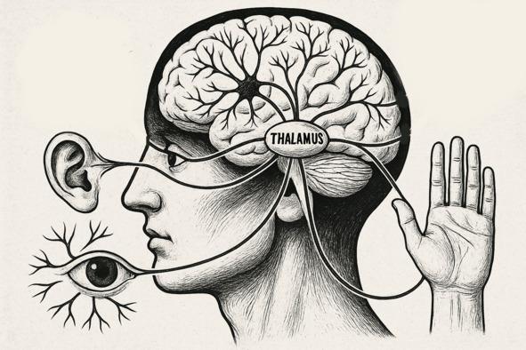 Чтобы понять, почему искажение сенсорного потока может лежать в основе аутизма, необходимо обратиться к ключевым механизмам обработки информации в мозге. В этом контексте таламус занимает особое положение. Он не просто передаёт сенсорные сигналы в кору — он их фильтрует, усиливает, подавляет, координирует по времени и значимости [1]. По сути, таламус — это сенсорный оркестратор мозга. Его можно сравнить с огромным зданием, полным дверей и коридоров, где каждая дверь ведёт к определённому отделу мозга. Представь себе: