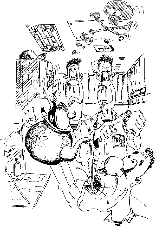 Бежим с ним, роняя кал, в шестнадцатый отсек. Жутковато, конечно. «Надобылоучитьсянабухгалтера» – думаешь в этот момент, но поздно уже. Прибегаем в шестнадцатый, а там декорации к фильму «Морозко»: всё в блестящем белом инее, холодина, из перемычки сосульки растут… Начинаем клапанами ручными перемычку от остальной системы отсекать, чтоб остальные дружно не бахнули сюда же. Клапана железные, руки примерзают, кожа рвётся, кровища капает – романтика. Перекрыли, возвращаемся в центральный, коленки трясутся, руки в крови. Командир встречает: