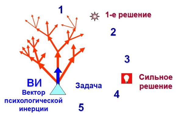 Попробуем разобраться почему, используя метод «проб и ошибок», получают слабые решения. Решая задачи, специалист, прежде всего, опирается на свои знания и опыт. Это хорошо, когда он решает известные ему типы задач. При решении принципиально новых задач, такой опыт подсказывает уже известные пути, которые в данном случае не помогают, а тормозят процесс. Эти решения, как правило, уже были опробованы, иначе задача была бы решена. Такой опыт оказывает «медвежью услугу». Память подсказывает уже известные решения, навязанные психологической инерцией. Это понятие также называют «инерция мышления» или «психологический барьер» Поэтому вектор психологической инерции всегда направлен в сторону решений низкого уровня (слабых решений) — решений 1-го, реже 2-го уровней.
