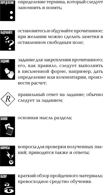 Основные термины и понятия выделены в книге жирным шрифтом, например, дивиденд. Ключевые моменты текста и задания для лучшего усвоения прочитанного помечены следующими пиктограммами: