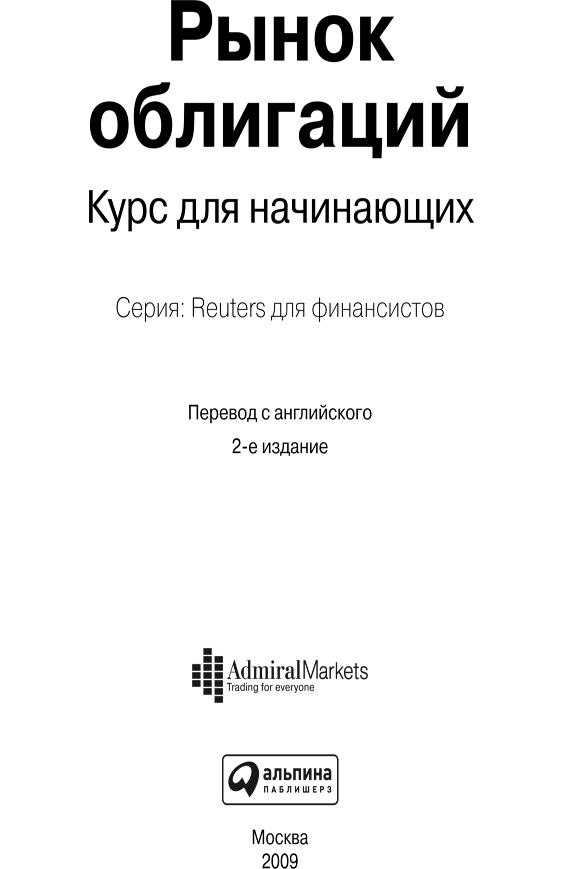 Представляем вашему вниманию книгу, изданную при поддержке международной брокерской компании Admiral Markets. Книга «Рынок облигаций» продолжает цикл «Курс для начинающих» от всемирно известного финансового информагентства Reuters. Компания Admiral Markets предпочитает сотрудничать с профессионалами в своей сфере, поэтому мы решили спонсировать издание всех книг этого цикла на русском языке. В него вошли наиболее востребованные пособия для подготовки трейдеров и аналитиков, которым в дальнейшем доведется ежедневно применять свои профессиональные навыки на практике.