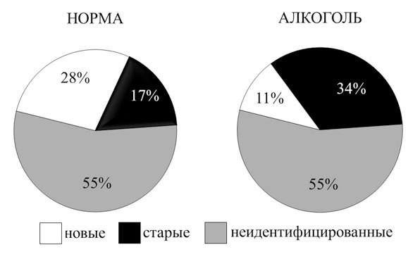 В многочисленных экспериментах, проведенных нами, было показано, что под влиянием алкоголя происходит относительное увеличение вклада реализации систем низкой дифференциации в обеспечение поведения как у человека, так и у животных. Его острое введение (этанол; 1 г/кг) животным вызывает достоверное и обратимое уменьшение числа активных в поведении нейронов мозга, принадлежащих к наиболее новым и дифференцированным системам (Alexandrov et al., 1990а, 1991, 2013; позднее сходные данные были получены и другими авторами; см. ссылки в Alexandrov et al., 2013). Например, в лимбической коре их относительное число уменьшается в 2,5 раза.