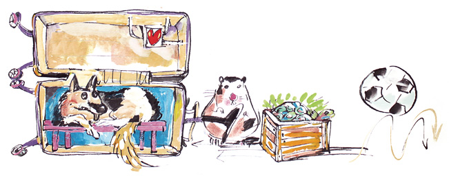 А можно поставить низенькую скамеечку. На скамеечку посадить сторожевую овчарку. Под скамеечкой тогда будет сидеть хомячок. А сбоку останется место для ящика с черепахой.