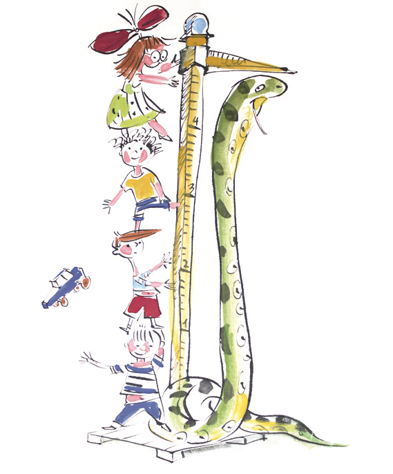 Однажды большой чемодан, который ещё не был папой, должен был изучить, можно ли поместить в него живую змею анаконду. Анаконда — это длинный удав. Самый длинный на свете. Если бы анаконда встала на кончик хвоста, а рядом с ней друг на друга поставили бы трёх мальчиков (пусть каждому будет три года), а на них — пятилетнюю девочку, то макушка девочки оказалась бы рядом с головой анаконды. Вот какой длинной была анаконда — пять с половиной метров. Её специально для этого эксперимента привезли из далёкой сельвы. Сельва — вечнозелёный лес, где очень жарко и влажно. Анаконда сидела в террариуме. Но как вынуть её оттуда и положить в чемодан?