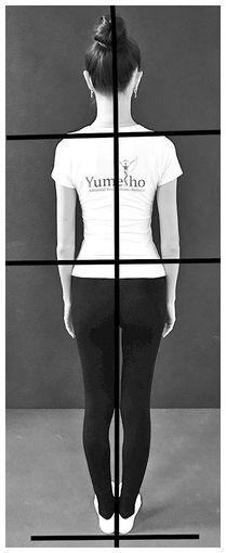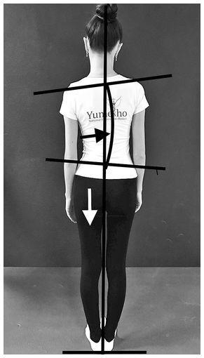 Рассмотрим пример правостороннего смещения таза 1-й степени (фото 2, 3). В положении лежа правая нога будет короче. В вертикальном положении таз наклонится в правую сторону. Крестец, на который опирается позвоночник, а именно 5-й поясничный позвонок, наклонится вправо вместе с поясничным отделом позвоночника. Чтобы сбалансировать правосторонний наклон таза, верхняя часть корпуса наклонится влево. Бо́льшая часть веса тела и центр тяжести при этом переместятся на левую ногу. Позвоночник изогнется дугой, выпуклостью вправо, а правое плечо поднимется вверх. Голова при этом слегка наклонится вправо, и в шее образуется небольшая дуга, выпуклостью влево. Таким образом, мы видим правостороннее смещение таза 1-й степени и при этом левостороннее смещение центра тяжести.