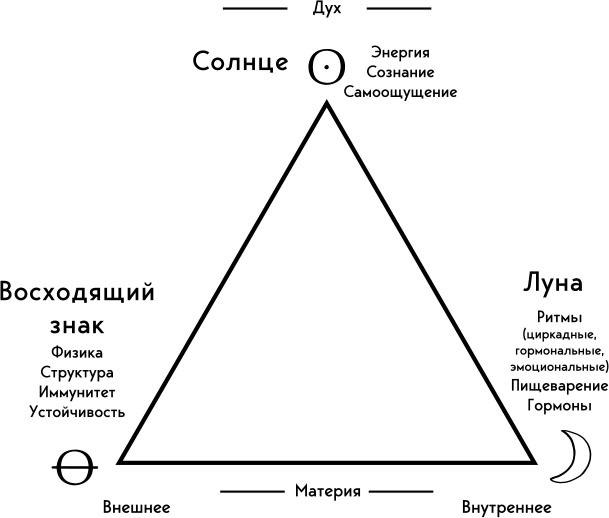 Основные столпы вашей персональной астрологии тела – это Солнце, Луна и восходящий знак. Читая соответствующие разделы, не забывайте, что хотя ваше тело – это сочетание этих трех элементов, они отвечают за разные аспекты вашего здоровья. Как показано на картинке на странице 16, Солнце в большей степени относится к духовной части (как животворящий Дух), тогда как Луна и восходящий знак больше относятся к материальному миру.