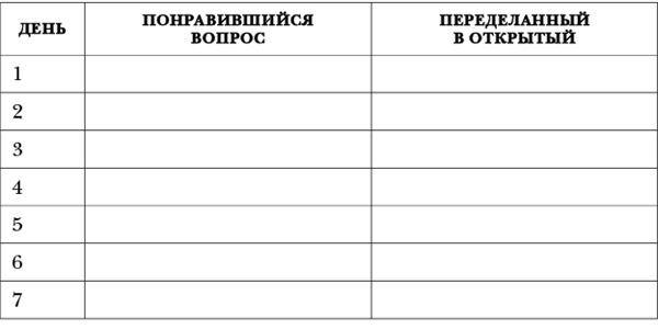 Ежедневно записывать понравившийся вопрос (вопрос может быть адресован вам или просто вы услышали в диалоге и посчитали его очень интересным) + трансформация в открытый, если необходимо. Минимум 5 вопросов. Старайтесь, чтобы открытый вопрос начинался на букву «к»