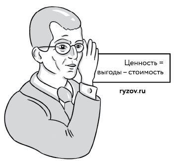 Ценность = выгоды, которые человек получает от сотрудничества с вами, минус стоимость, которую он должен заплатить. Забегу вперед и скажу, что в последующих главах мы улучшим эту формулу, доработав ее. Но пока возьмем за основу уравнение: