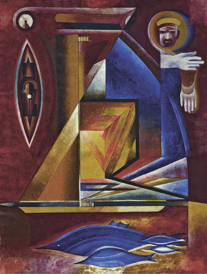 Сюрреалистические черты заметны в рисунках Юдина 1920-х годов: плавные формы «Женщин»10 подобны водорослям, таят в себе загадку, струятся, стекают по поверхности, переплетаясь друг с другом; в «Груше» (1926, ГРМ) формальное отступает перед «психическим», и узнаваемые очертания обретают странноватый вид, превращаясь то ли в сокращающийся, телесный орган, то ли в потертый кожаный мешок… Сюрреалистические умонастроения очевидны в картинах 1930-х: иррациональные интонации; предметная форма как одушевленная, текучая субстанция; «чувственность», «податливость», тревожность пластических элементов; бытовые вещи, превращенные в символические объекты. «Кофейник, кувшин и сахарница» (середина 1930-х, ГРМ) — «непосильная чистота»11 синего фона, условное, неопределенное, лишенное реальных координат пространство, процессия разъединенных, подчеркнуто несхожих предметов, балансирующих на краю кухонного стола, словно на краю пропасти, хищная вилка, вещи, ведущие себя, как живые существа. «Голубой натюрморт» (1937, ГТГ), где за кубистической в своей основе конструкцией возникает беспокойная, «запутанная», саморазвивающаяся, причудливая субстанция. Привычный облик вещей разрушен конвульсивным движением цветоформ. Атмосфера таинственности, чувственного экстаза: множатся, наслаиваются и дробятся предметы, мечутся «нервные» тени… «Рыбки в бутылке» (середина 1930-х, ГРМ) — рискованная и раскованная, почти акробатическая композиция, наполненная сложным, «танцевальным» движением, формы-оболочки — гибкие, искривленные, обтекаемые, каплеобразные — как жгутом схваченные общим контуром…