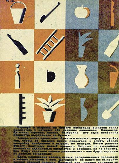 В этот контекст следует включить и биоморфную абстракцию декоративно-прикладных миниатюрных работ13, которые находят пластические аналогии в творчестве Арпа или Миро. И даже детскую иллюстрацию, такую как спинка обложки для журнала «Чиж»14: «отклоняющееся поведение» фигур, которые ломают установленный композиционный и ритмический порядок; рассеченные пополам, кажущиеся аномальными предметы; волнующее сочетание условности и иллюзорности (тела и тени, изображения и знака, бытия и небытия). Здесь наблюдается определенное совпадение с «Алфавитом откровений» Магритта (1929).