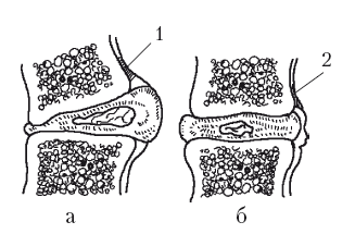 Рис. 11. Отрыв передней продольной связки от тела позвонка (а) и образование остеофита на месте отрыва (б) (схема): 1 – место отрыва передней продольной связки; 2 – костеобразавание на месте отрыва связки