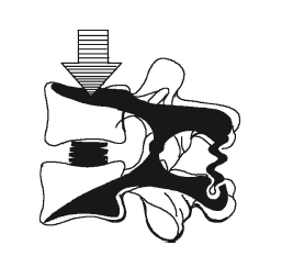 Студенистое ядро представляет собой центр, вокруг которого происходят взаимные перемещения смежных позвонков. При сгибании позвоночника студенистое ядро перемещается кзади, при разгибании – кпереди, при боковых наклонах – в сторону выпуклости. При условии сохранения жидкого студенистого ядра, а также окружающего его эластичного и упругого фиброзного кольца сегмент может в полной мере выполнять буферную функцию, совмещая свойства рессоры и амортизатора (рис. 5). Эти свойства позвоночника известны давно. Буферная функция тем совершеннее, чем больше жидкости имеет студенистое ядро, чем больше эластичность и выше тонус фиброзного кольца, позволяющего ядру смещаться при движениях. С возрастом эти свойства межпозвоночного диска постепенно утрачиваются.