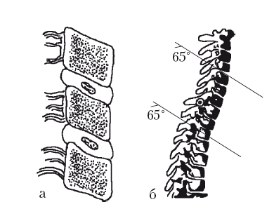Рис. 8. Форма и расположение позвонков в шейном и верхнегрудном отделах позвоночника в боковой проекции: а – форма тел шейных позвонков; б – наклон тел позвонков вперед и вниз