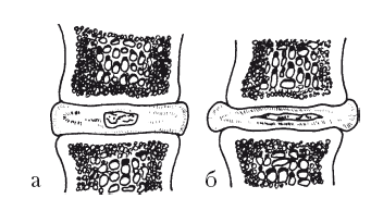 Рис. 14. Уплощение диска при дистрофических процессах в нем (схема): а – нормальный диск; б – диск с пониженным тонусом