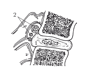 Рис. 16. Выпячивание диска кзади, сдавление нервов и сосудов при сгибании позвоночника (схема): 1 – выстоящий кзади диск; 2 – корешок нерва и сосуды