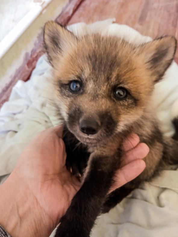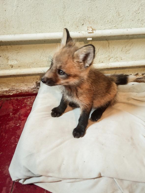 Лисичка оказалась маленькой дикаркой. Она не дается в руки, прячется между стеной и коробкой, фырчит на нас. Мы заранее приготовили бутылку с соской и козье молоко. Теперь осталось дело за малым — поймать малышку и накормить.