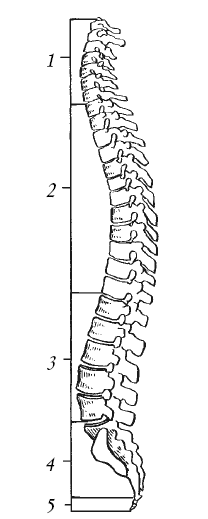 Рис. 9. Позвоночный столб: 1 – шейные позвонки; 2 – грудные позвонки; 3 – поясничные позвонки; 4– крестец; 5– копчик