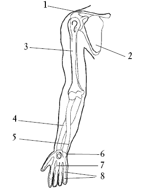 Рис. 10. Скелет верхней конечности: 1 – ключица; 2 – лопатка; 3 – плечевая кость; 4 – лучевая кость; 5 – локтевая кость; 6 – запястье; 7 – пястные кости; 8 – фаланги пальцев