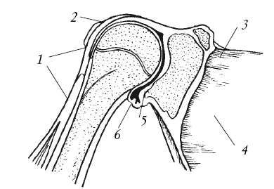 Рис. 11. Плечевой сустав (продольный разрез): 1 – сухожилие длинной головки двуглавой мышцы плеча; 2, 6 – суставная сумка; 3 – верхняя поперечная связка лопатки; 4 – лопатка; 5 – суставная впадина лопатки
